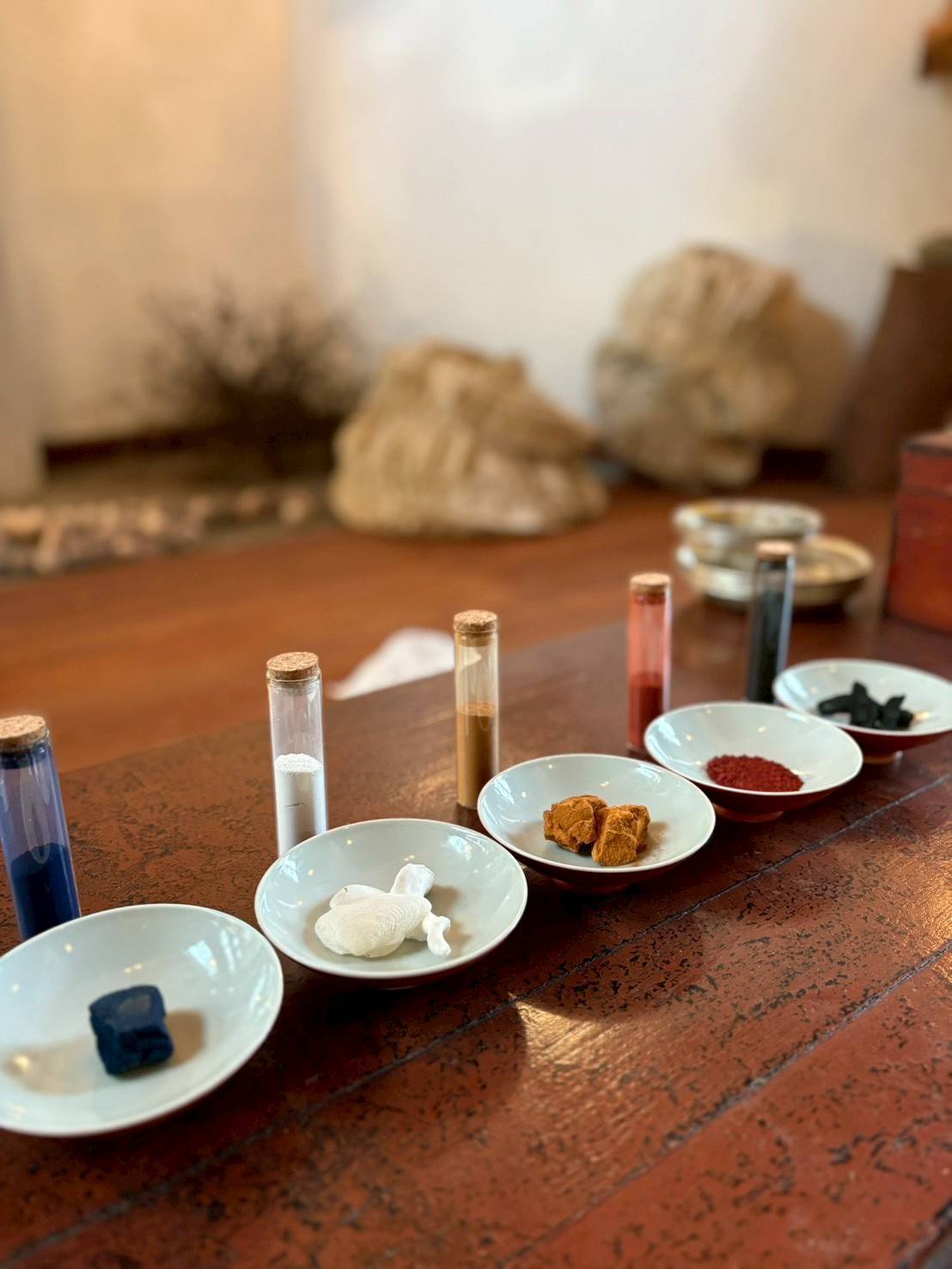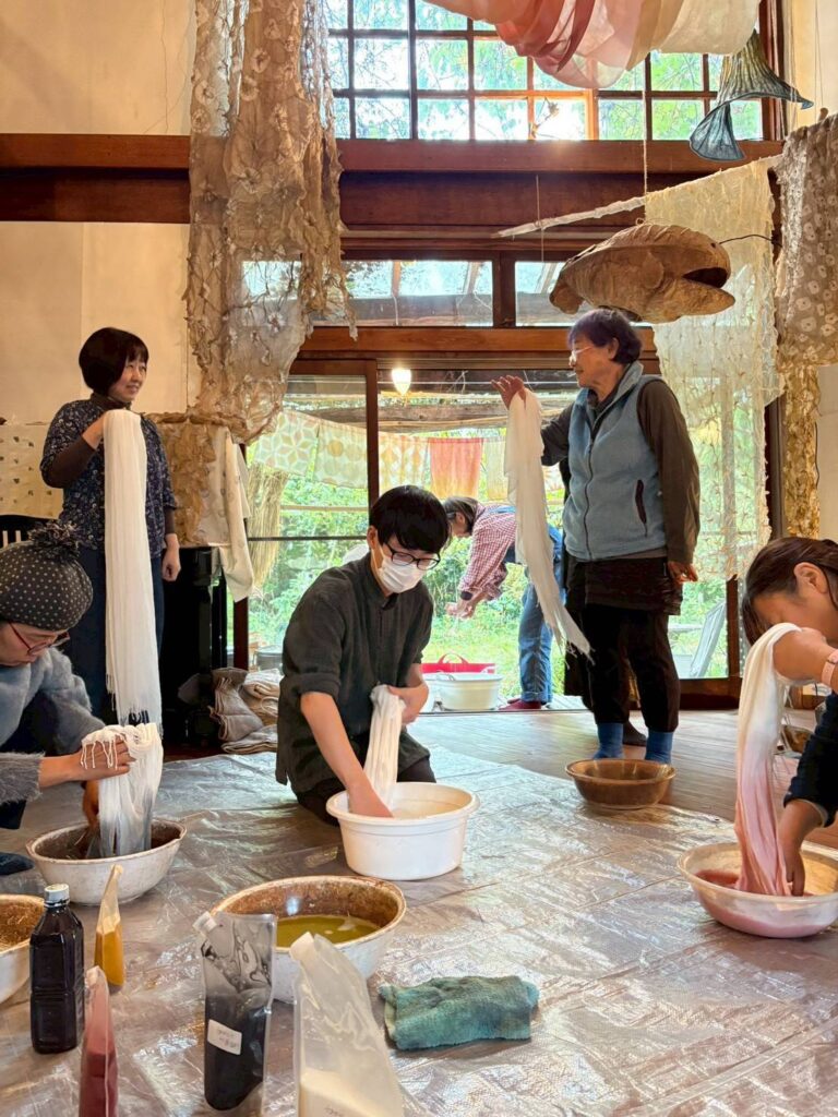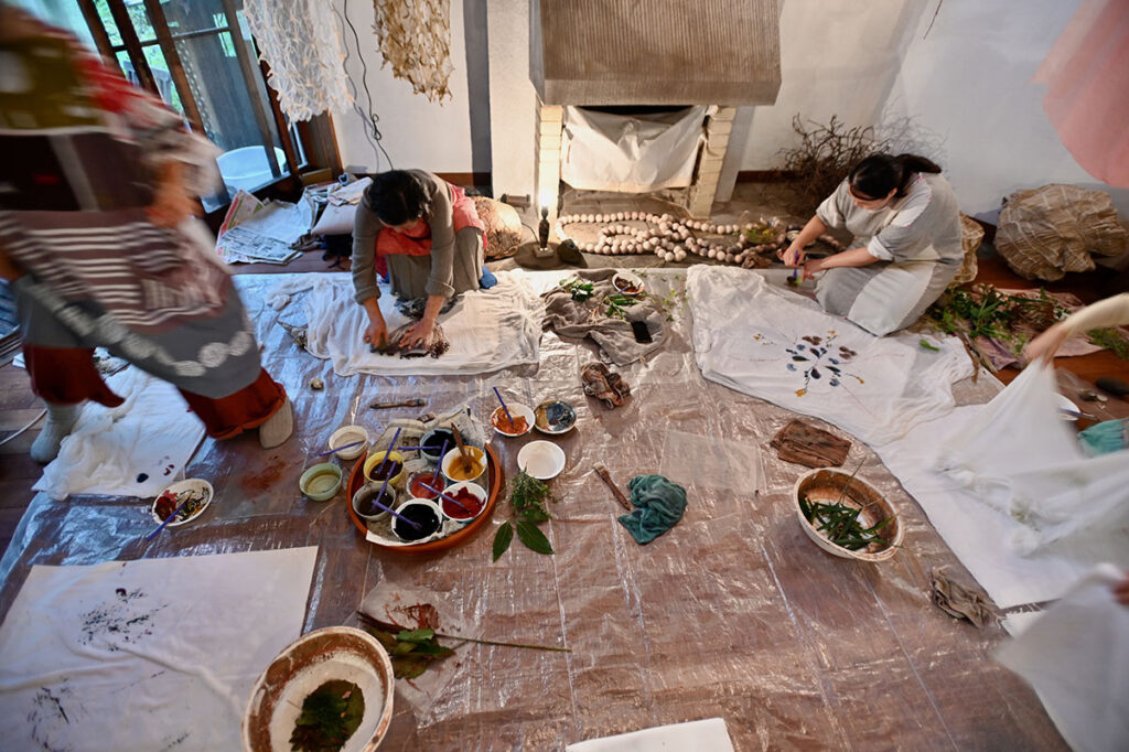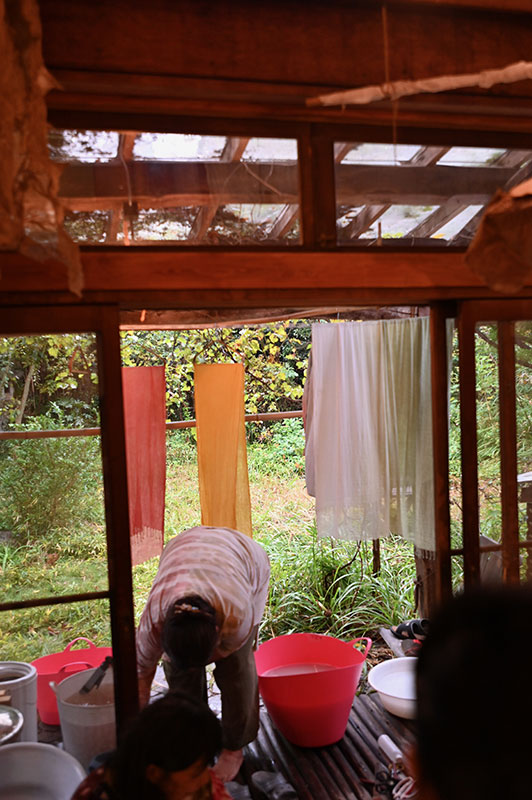 ベンガラと貝殻。藍と竹炭。じねんの色、五色で染める。