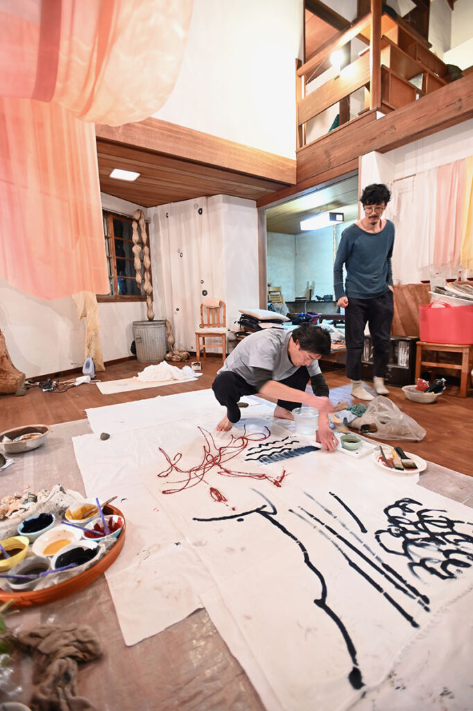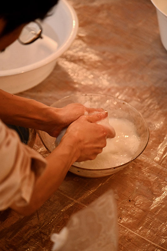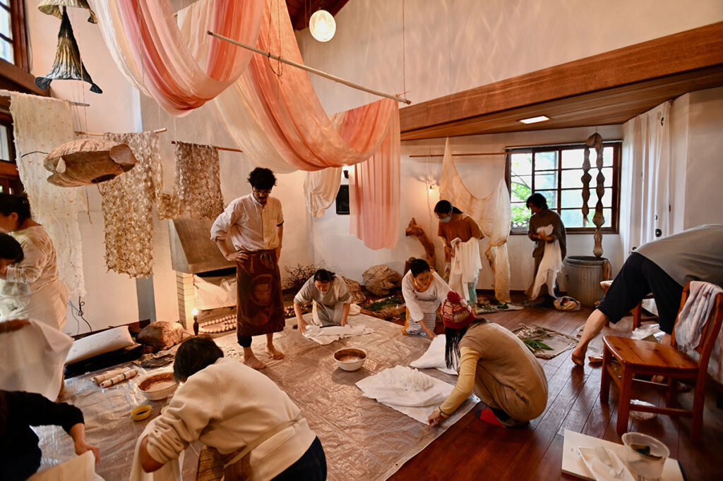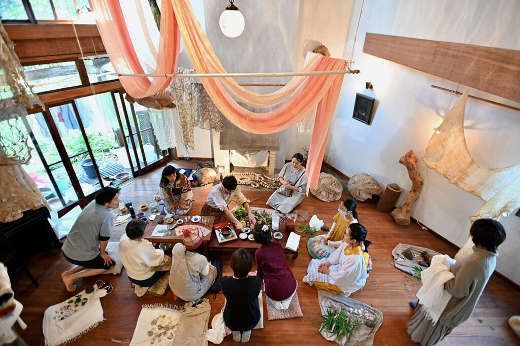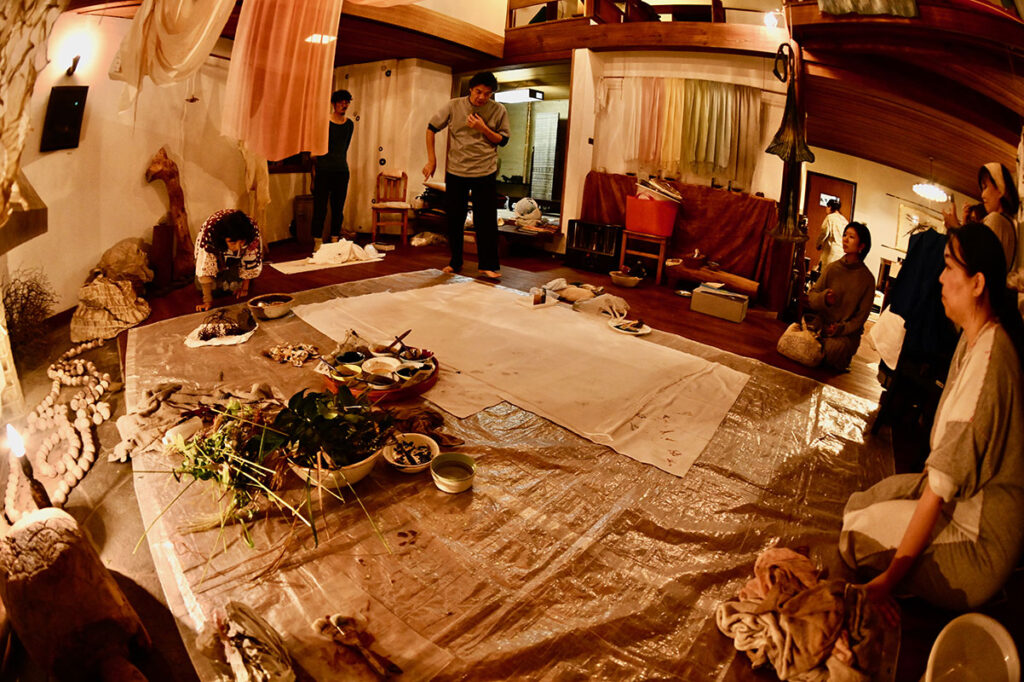 ベンガラと貝殻。藍と竹炭。じねんの色、五色で染める。