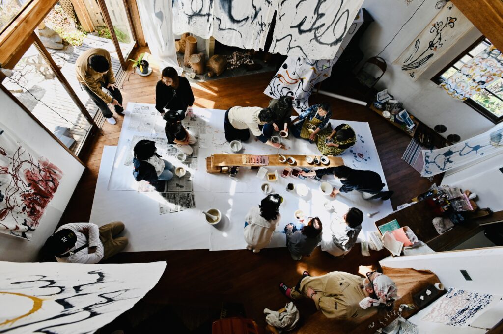 イラストレーターのサイトウマサミツさん、土染めの小渕裕さんによるワークショップ「和紙にベンガラで描く」